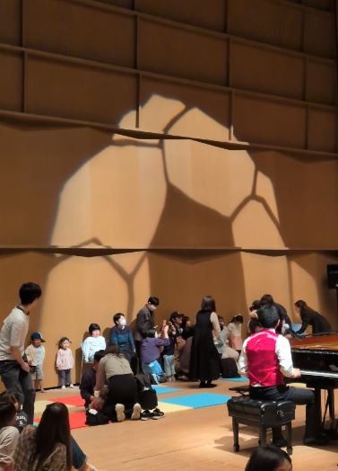 会場は、普段は足を踏み入れることのない大ホールのステージ上。観客は「特別な場所」にいることにワクワクしながら、プレイマットスペース、椅子席、ベビーカーのまま入れるエリアなど思い思いの場所へ。また、楽器への好奇心を刺激する演出として、グランドピアノは蓋を外した状態で設置しました。保護者に抱っこされた子どもたちが、ピアノの内部を覗き込み、弦の振動やハンマーの動きに目を輝かせる姿は、このコンサートならではの光景でした。