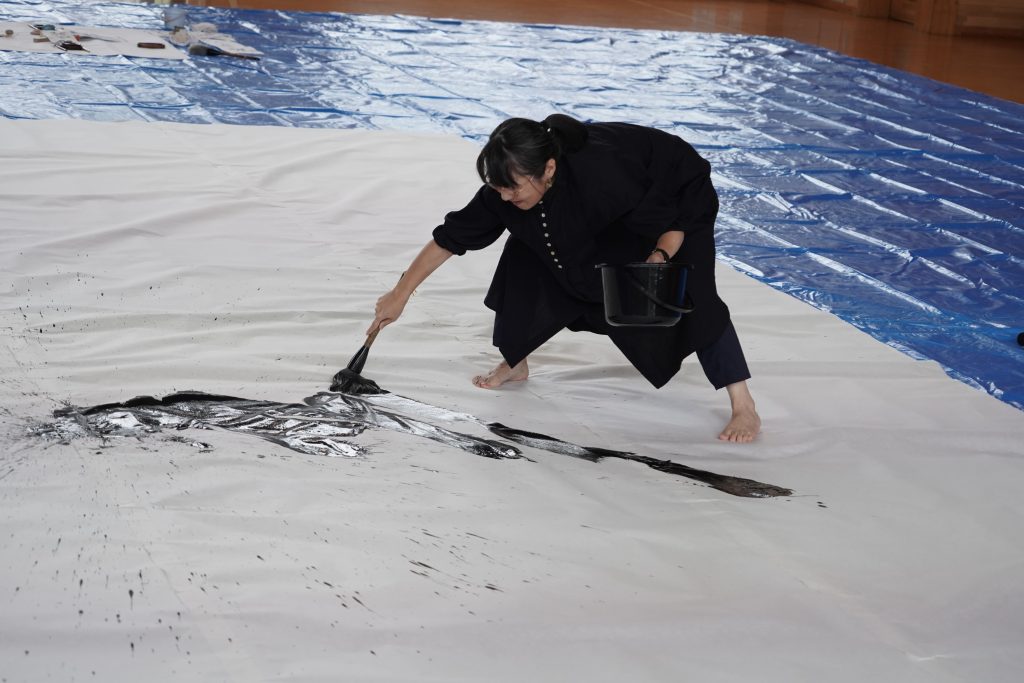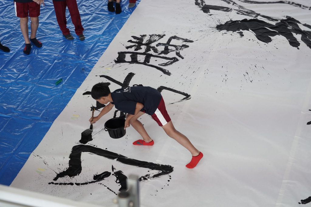 最初に點さんが書道のパフォーマンスを行いました。約4.2m×10mの紙の中央に、大筆で新堀小学校の「新」という字を書きました。「新」には、今日のこの出逢いと機会がこれからの新しい1日のはじまりになるように、という點さんから児童の皆さんへのメッセージも込められています。児童の皆さんは點さんの力強いパフォーマンスに釘付けになっていました。