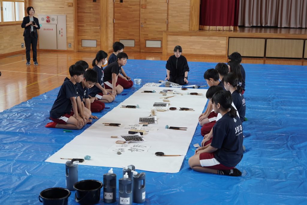 點さんのお話を踏まえ、実際に磨墨(まぼく)をして、自由に字や絵をかいてみました。墨自体の色の違いや磨った墨に加える水の量によって、書いた時の色が変わってきます。児童の皆さんは筆だけではなく、藁や羽、自分の手を使って書くことができる書道の自由さをとても楽しそうに体感している様子でした。
