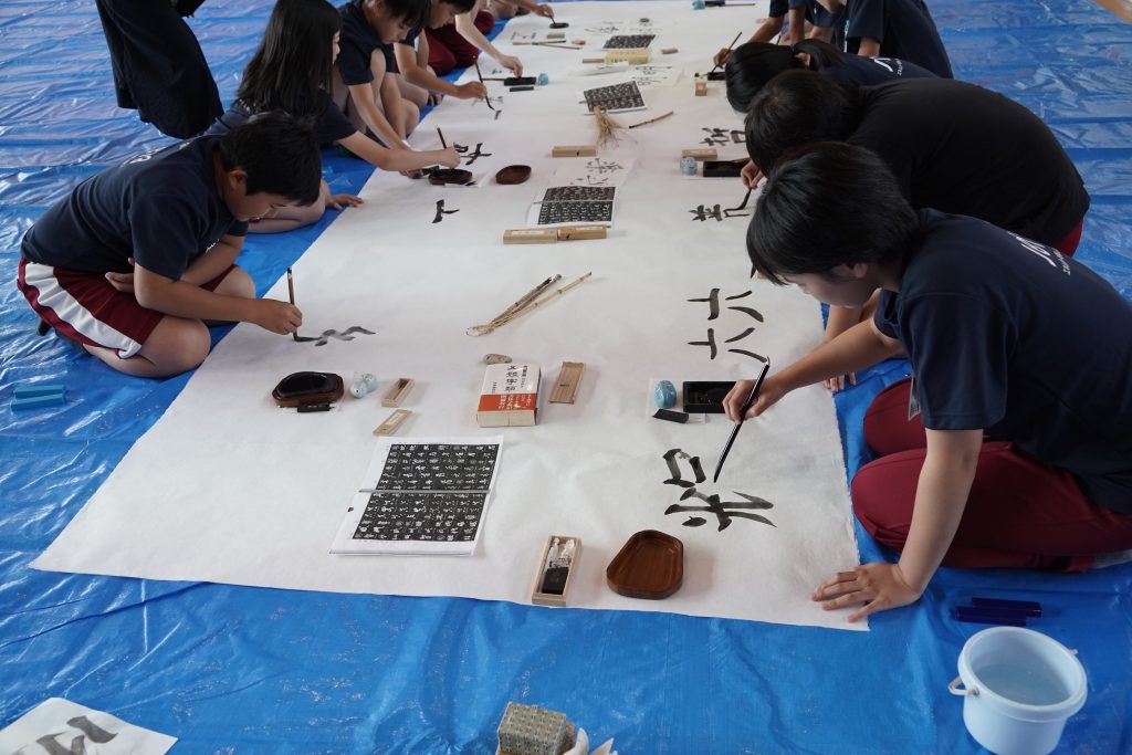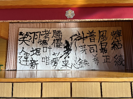 最後に、授業の始めに點さんが中央に書いた「新」を囲むように、各々が大筆を使って好きな漢字を書きました。大筆で大きな紙に字を書くことに難しさや緊張を感じている様子もありましたが、皆さんの堂々とした力強い筆運びにより、素敵な作品が完成しました。